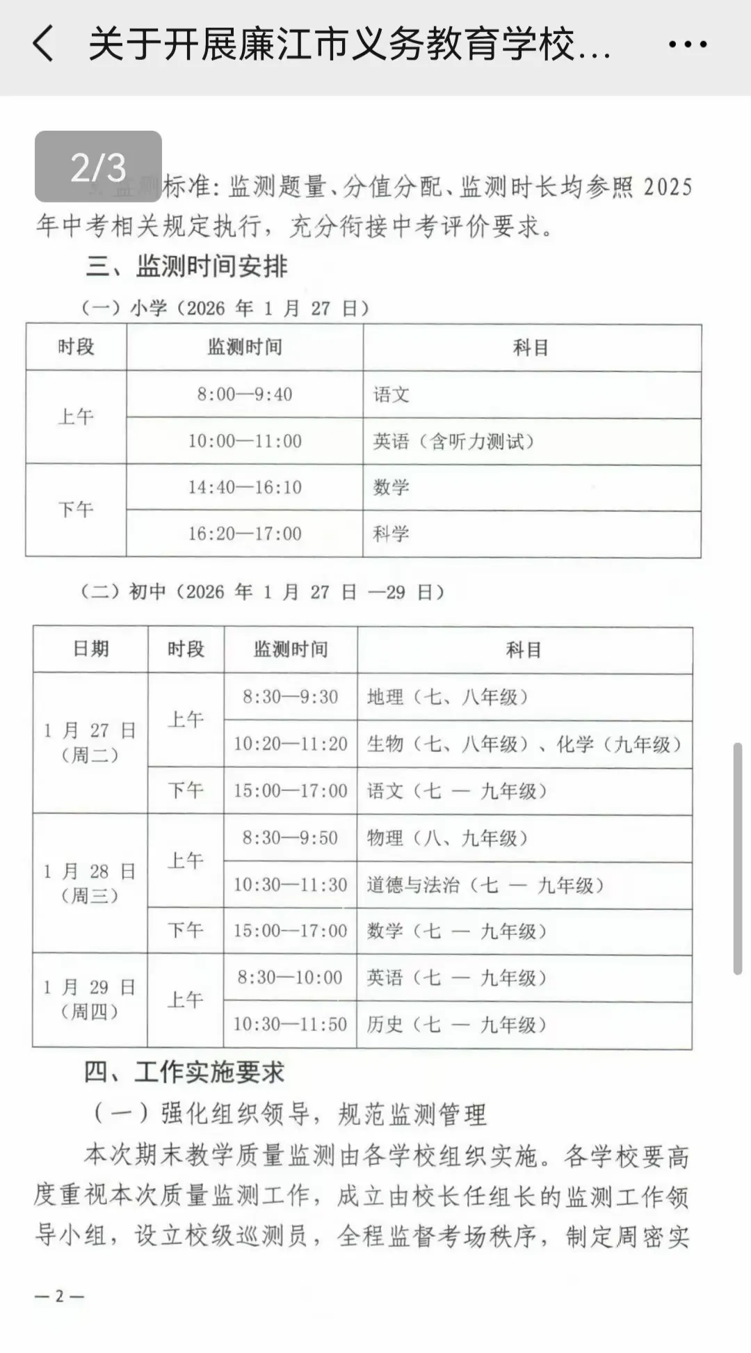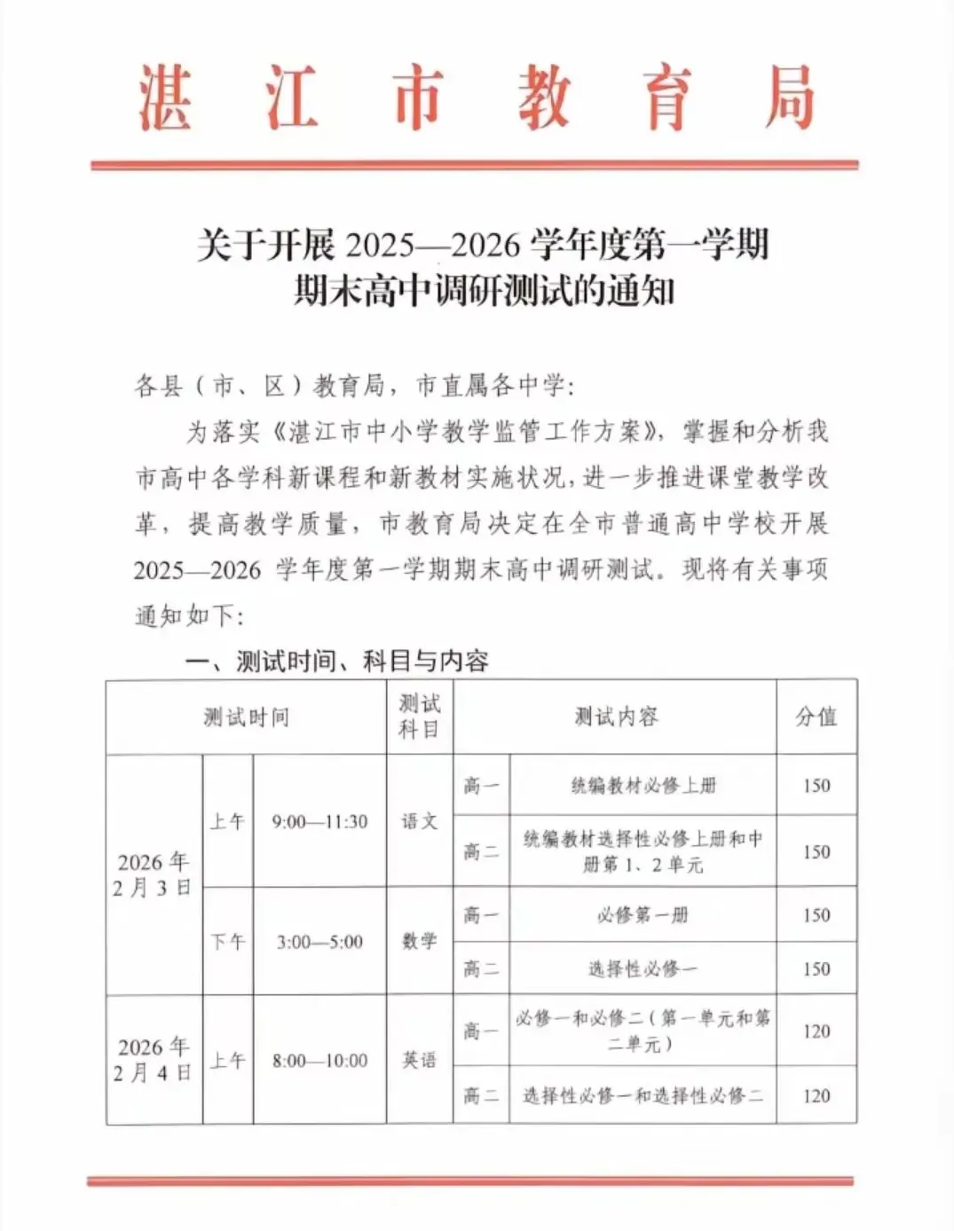 注:考试时间基本确定在校历放假前几天了,具体以教育局及所在的学校及老师最新通知为准了,考试时间以实际安排为准。据此前湛江市教育局发布的