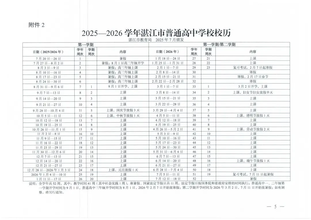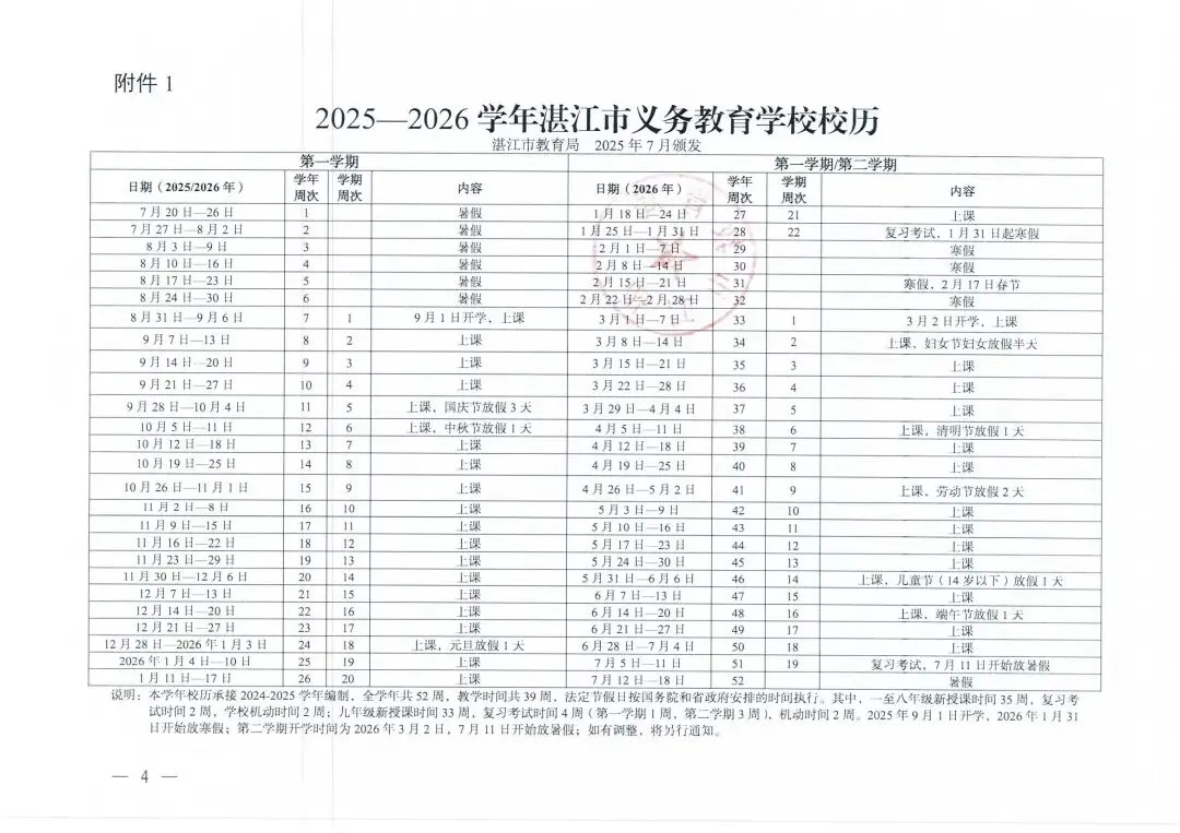 湛江市2025—2026学年普通中小学校校历及中等职业学校校历