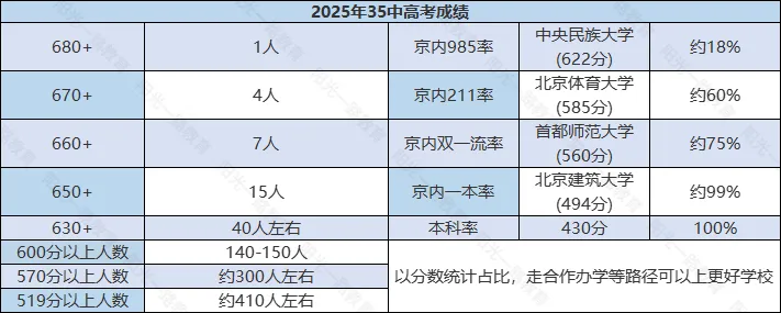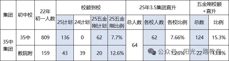 下周三晚7点 西城中考线上讲座,主要讲讲最近沸沸扬扬的0.5+3以及后续中招趋势,扫码即可预约直播,开播微信会有提醒~三十五中此前拥有官方认可的六年一贯制项目班型,对初高贯通培养的探索走在西城区各校前列。26年三十五中集团直升标准与计划跟25年相比没有太大变化,依然是计划招收70人:八下九上年排前200名有报名资格(各集团标准不一,其他集团可文末扫码咨询),目测头部学生报名的会比较少,25年招收的多为肩部学生。这也是二梯队各集团龙头高中招收集团直升学生的普遍现状。根据去年一位年排160名左右最终录取到直升班的家长反馈,去年35中直升班在“正式”升入高一后会换一波老师。那么,处于该集团本部初中肩部位置的学生,到底要不要选择直升?(数据出自此前汇总文章,仅供参考,以官方发布为准)暂不确定这一数据是否包含去年已直升的62个学生,很大概率是不包括的。那么考虑到已直升学生的情况,也就是说25年初三上期末直升的学生,到中考分数大概率会落在467以上。所以,过几天的初三上期末考之后,除非非常自信中考能超常发挥,否则年排大约在160-200名的学生能签直升都可以考虑直接签。160名之前的学生,就要结合大约60+个五金刚校额自己考虑:今年集团直升继续大幅扩招,如果各名校不能大幅扩充学位,那么三十五中初三上期末校排120-160名这部分学生想通过拼统招进入五金刚势必会更加艰难,而校额又很可能占不上……另外,还有一个因素很多人会忽略,就是包括本次期末在内,集团直升参考的历次大考成绩不会计算按照政策能够中考加分的情况,考多少分就是多少分。那么假如你没有加分,中考时还会被其他加分考生挤压一部分名额。在总分已经变为510分的情况下,加分占总分比例大幅提升了(相关文章)。相应的,假如你能够按照政策中考时加分,就要把这一情况加入考量。(数据来自博主:Jin.YK,仅供参考,以官方发布为准)
