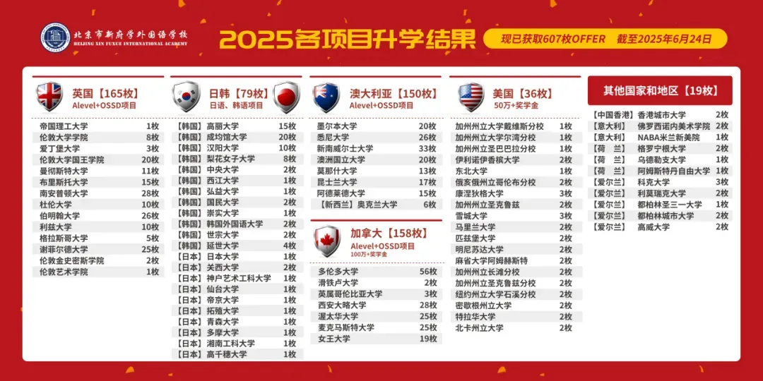 截至2025年6月24日,新府学2025届毕业生已累计获得中国香港、美国、英国、澳大利亚、加拿大、韩国、日本、意大利、新西兰、荷兰、爱尔兰等地区/国家607份offer奖学金共计30万美金。