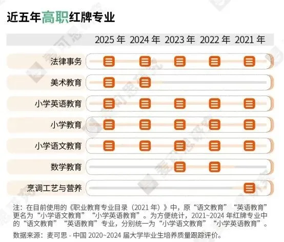 根据近五年《中国高职生就业报告》发布高职红牌专业榜单来看,小学教育、小学英语教育、小学语文教育已经连续五年被列为红牌专业,美术教育专业也在近两年连续进榜。