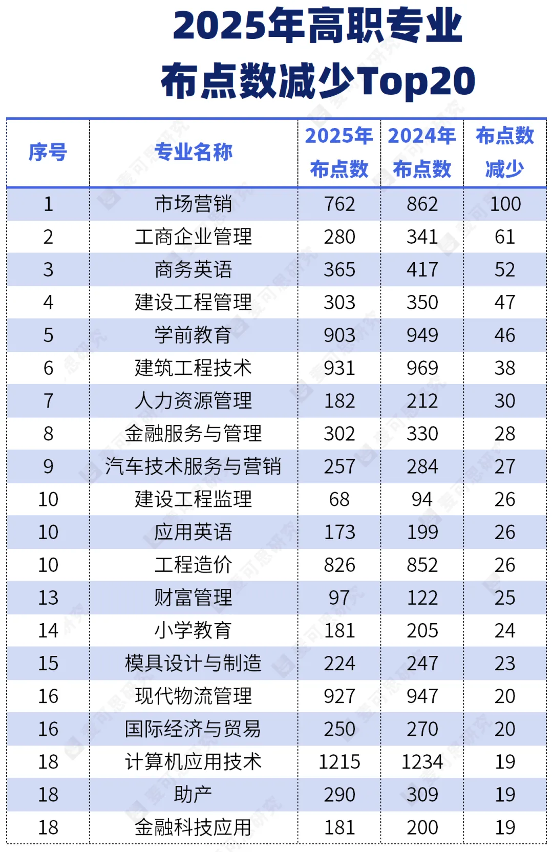 进入2025年高职撤销/停招专业榜前十的专业还有建设工程管理(减少47个专业点)、学前教育(减少46个专业点)、建筑工程技术(减少38个专业点)、人力资源管理(减少30个专业点)、金融服务与管理(减少28个专业点)、汽车技术服务与营销(减少27个专业点)、建设工程监理(减少26个专业点)、应用英语(减少26个专业点)、工程造价(减少26个专业点)。