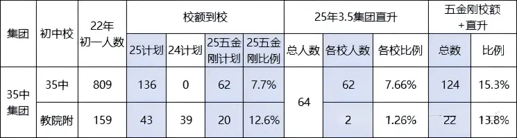 对于年排 160 名之前的学生,需结合 “五金刚” 校额到校政策综合权衡。2025 年 35 中集团相关升学数据显示(如下表),自 2024 年启动 3.5 集团直升政策后,“五金刚” 普通班的区排占比已普遍提升。2026 年集团直升持续大幅扩招,若各名校学位未同步大幅增加,那么 35 中初三上期末校排 120-160 名的学生,想通过统招进入 “五金刚” 的难度将进一步加大,而校额到校名额也存在不确定性。