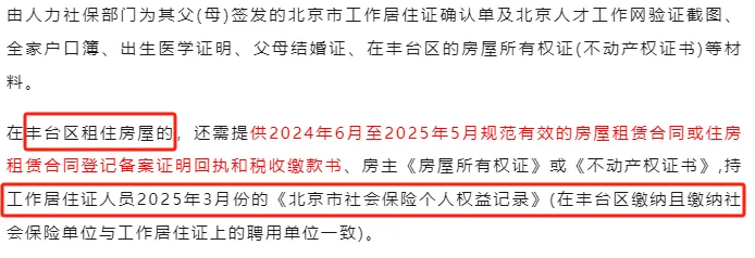 丰台区租房入学,需提供2025年5月3月份的《北京市社会保险个人权益记录》(在丰台区缴纳且缴纳社保单位与工作居住证上的聘用单位一致)