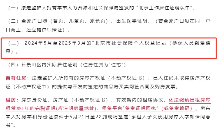 石景山区持北京工作居住证入学需提供2024年5月至2025年3月的社保。