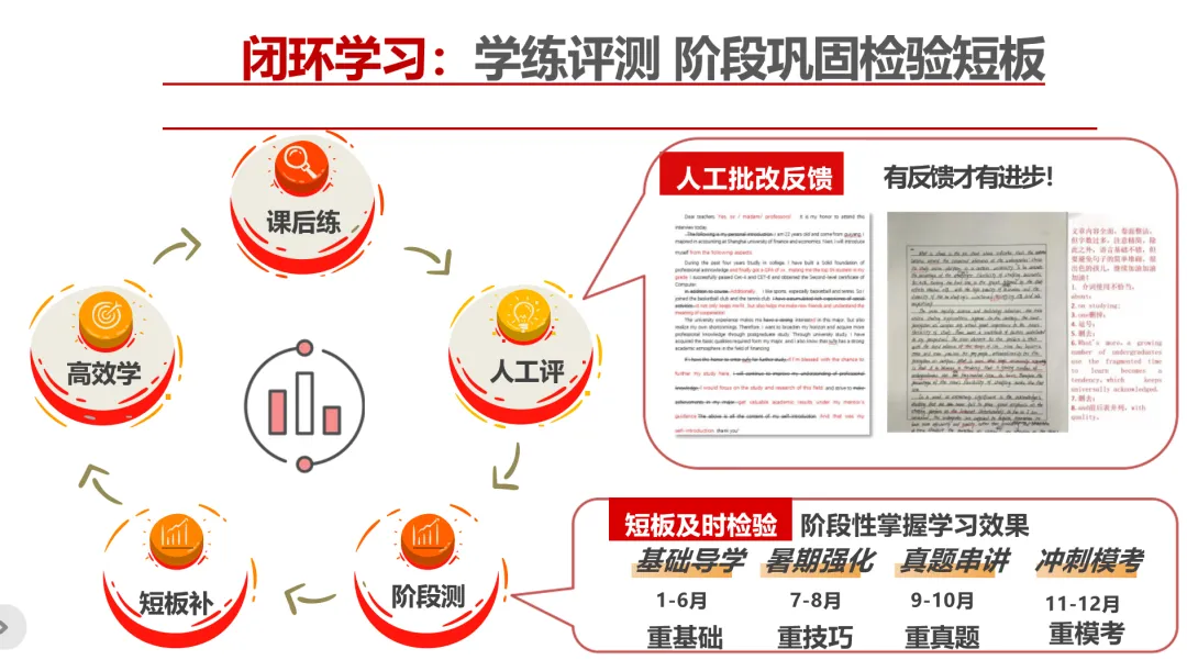 小班教学,全程定向服务;志同道合研友为伴,一线老师赋能。学练评测,阶段巩固检验短板。高效学>>>课后练>>>人工评>>>阶段测(短板及时检验,阶段性掌握学习效果)>>>补短板>>>高效学。