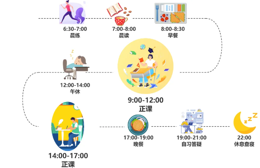 每周提供茶歇,免费健身房,体育器材,述飞特色活动,生活老师全天候陪同监督,提供生活上的服务。咨询老师和答疑老师提供学习和心态上的服务。学习生活,双重保障