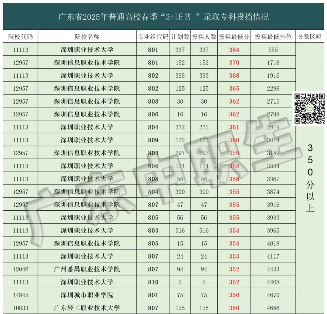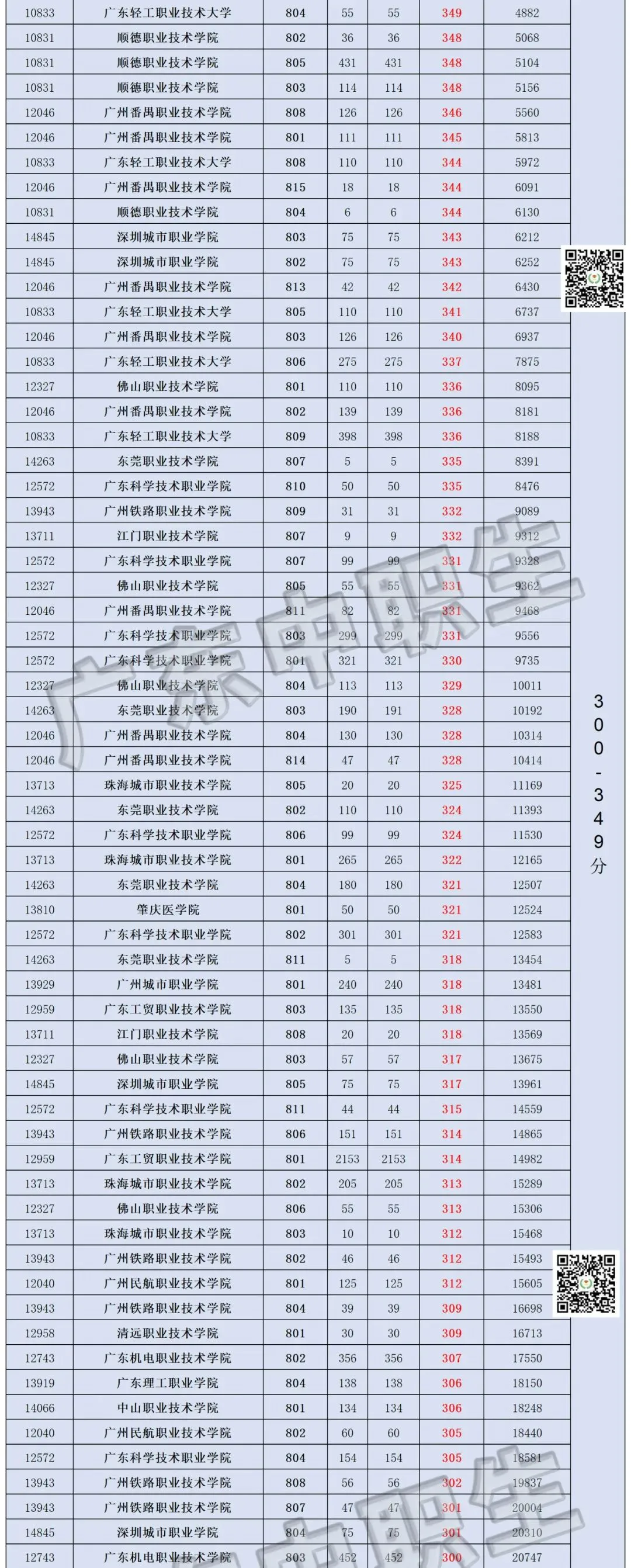 350以上分段属于高分段,高分段学生可选择的公办院校数量较多,而且大都是珠三角地区的热门公办院校及专业组,其中包括深职、广轻工、深信、顺职、番职这5所头部知名院校。也可以选择300分以上的一些学校。提醒另外深信、顺职、番职今年已经升本了。