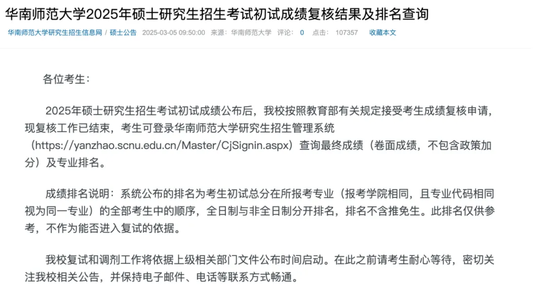 比如华南师范大学公布的排名为考生初试总分在所报考专业(报考学院相同,且专业代码相同视为同一专业)的全部考生中的顺序,全日制与非全日制分开排名。