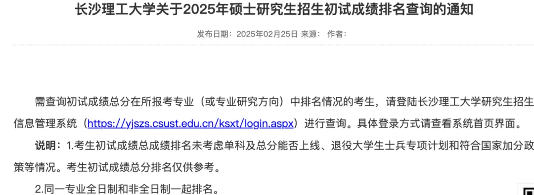 长沙理工大学则是【1.考生初试成绩总成绩排名未考虑单科及总分能否上线、退役大学生士兵专项计划和符合国家加分政策等情况。考生初试成绩总分排名仅供参考。2.同一专业全日制和非全日制一起排名。】