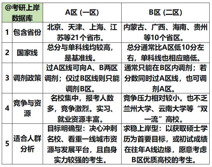 如果你实力强劲、志在顶尖学术或一线城市发展,选A区;如果更看重学历提升的确定性,或分数优势不大,B区的优质高校是性价比很高的选择。