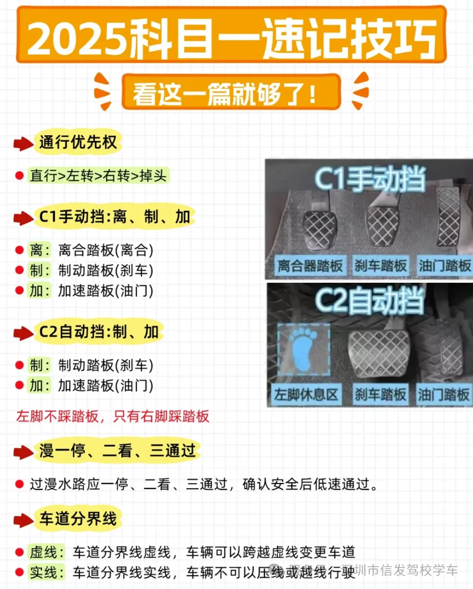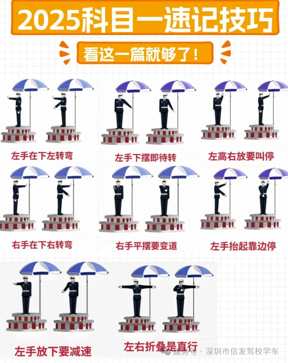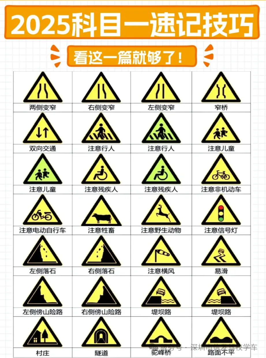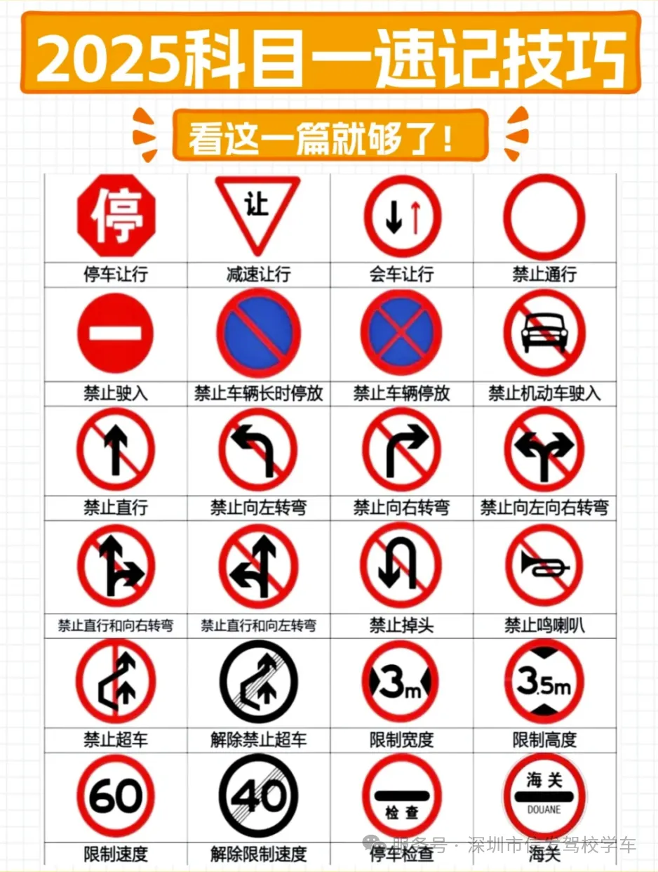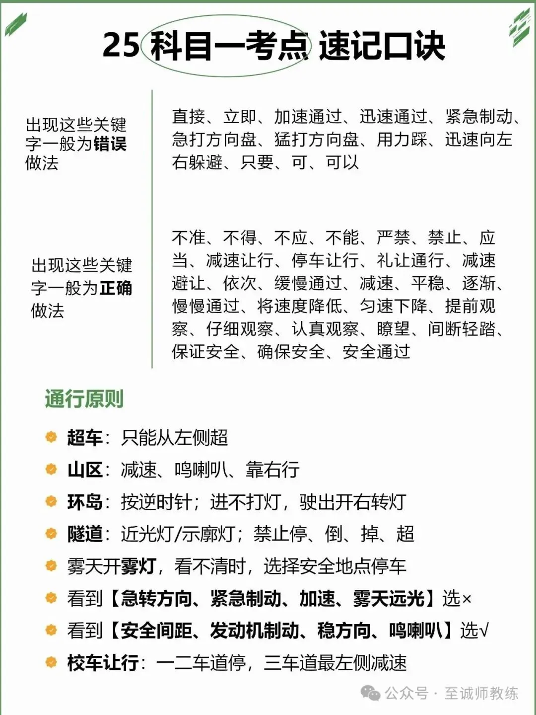 科目一考试必看的口诀分享: 一般正确的做法: - 不让你做的:不准、不得、不应、不能、严禁、禁止、应当 - 让别人先走:减速让行、停车让行、礼让通行、减速避让、依次 - 慢慢来的:缓慢通过、减速、平稳、逐渐、慢慢通过 - 需要注意的:提前观察、仔细观察、认真观察、瞭望 - 保证安全的:间断轻踏、保证安全、确保安全、安全通过一般错误的做法: - 毫不犹豫的:直接、立即、加速通过、迅速通过 - 过激反应的:紧急制动、急打方向盘、猛打方向盘、用力踩、迅速向左右躲避 - 不听指挥的:只要、可、可以 用这些小技巧准备科一考试,相信没那么难的!交警手势题也是科目一的必考题之一,大家做题的时候,一定要认真看清图片中手势方向。禁令标志题技巧如下图。别混淆了。很多同学容易记混淆。点赞关注分享接好运,祝大家考试都一把过。