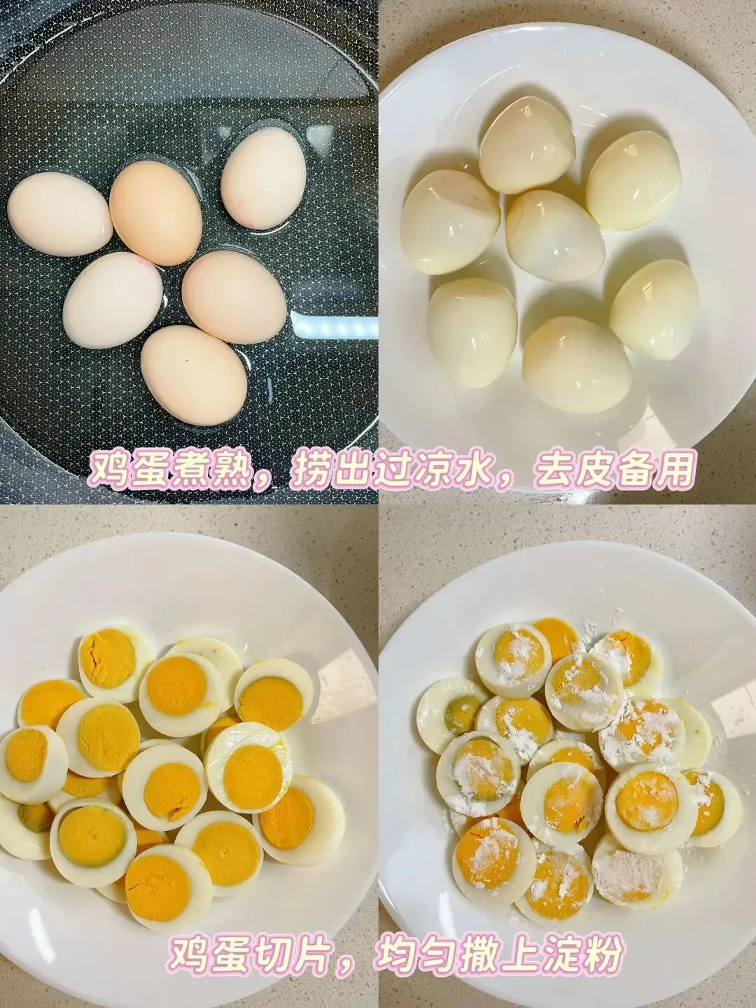 1. 鸡蛋冷水下锅煮熟,捞出过凉水后剥去蛋壳,将鸡蛋切成厚片,均匀撒上淀粉备用。
