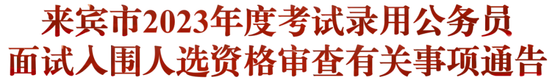 为做好来宾市2023年度考试录用公务员面试资格审查工作,按照《广西壮族自治区2023年度考试录用公务员公告》的要求,来宾市2023年度考试录用公务员面试入围人选需提供报名申请材料进行面试资格审查。现就有关事项通告如下: