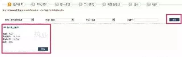 选择需要报考的项目,以临床执业医师为例:在类别中,选择医师资格考试,级别选择执业,专业选择临床,然后点击搜索,下方将显示考试项目,确认是自己报名的考试项目后,点击报名按钮。