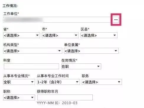 点击右侧的三个圆点按钮,从工作单位列表中,选择自己所在的工作单位,确认无误后,点击确定,然后将单位的所在地区、机构类型、单位隶属以及在岗情况等标有红色星号的内容,按照实际情况填写完整,下方的职务、职称情况如果没有可不用填写,再次核实无误后,点击下一步。