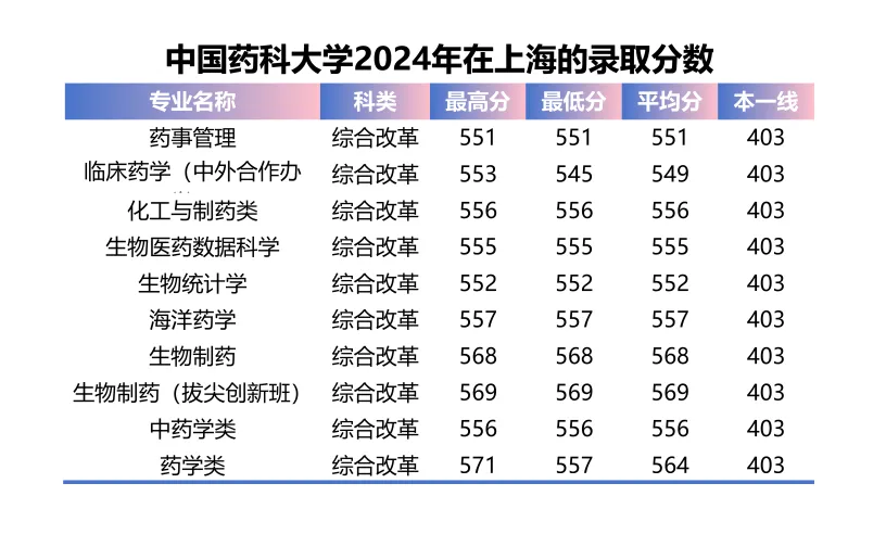 中国药科大学2024上海分专业录取分数线