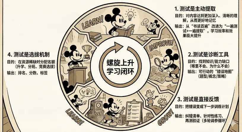 测试的首要功能,是主动提取,促进理解和记忆。(记忆是学习的基础,只有记忆中有足够清晰和有序关联的知识组块,才能产生创造性思维活动)