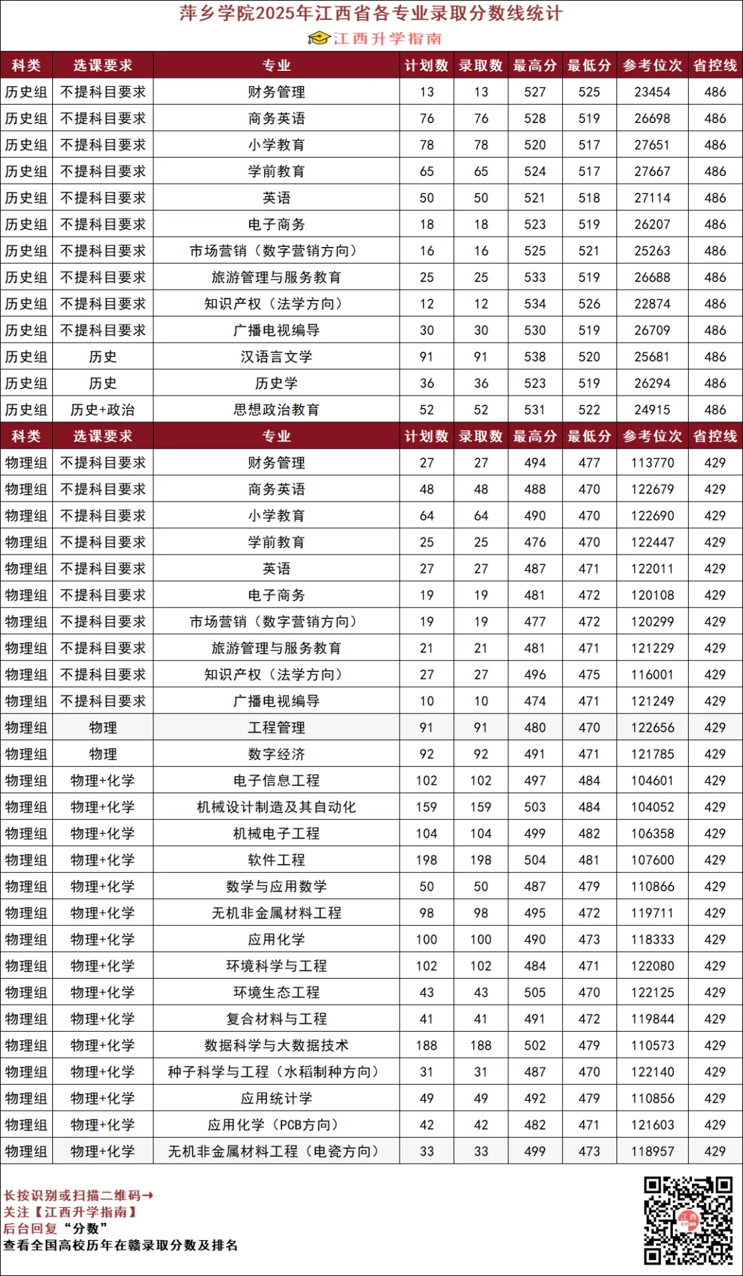 >萍乡学院2025年江西省各专业录取分数线统计!