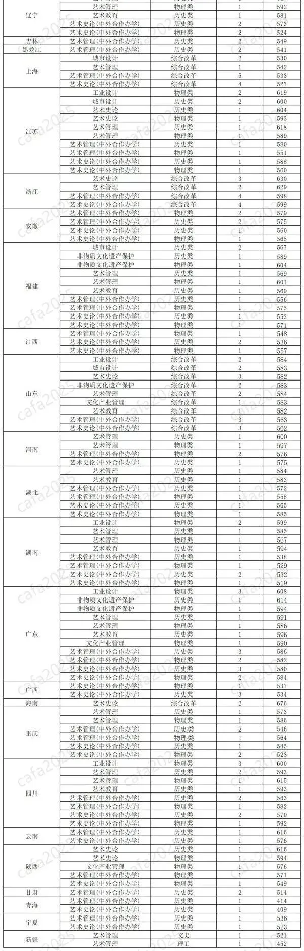 2、建筑学、美术学、艺术设计学:高考综合改革省(自治区、直辖市)考生高考文化课成绩达到所在省(自治区、直辖市)相应科类特殊类型招生录取控制分数线;西藏、新疆考生高考文化课成绩达到所在自治区普通本科一批相应科类录取控制分数线,按校考成绩择优录取;