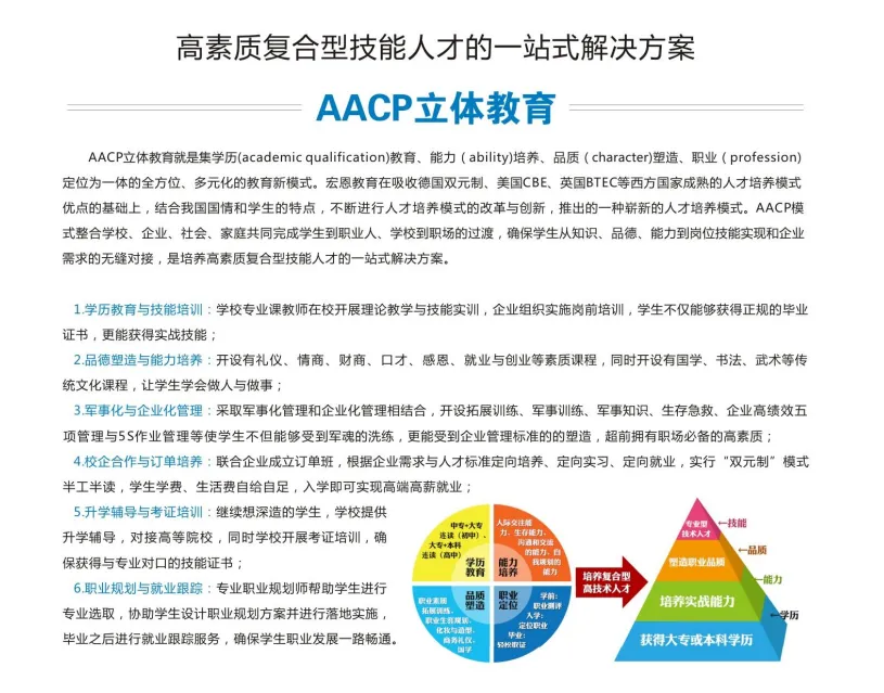 AACP立体教育就是集学历(academic qualification)教育、能力(ability)培养、品质(character)塑造、职业(profession)定位为一体的全方位、多元化的教育新模式。宏恩教育在吸收德国双元制、美国CBE、英国BTEC等西方国家成熟的人才培养模式优点的基础上,结合我国国情和学生的特点,不断进行人才培养模式的改革与创新,推出的一种崭新的人才培养模式。AACP模式整合学校、企业、社会、家庭共同完成学生到职业人、学校到职场的过渡,确保学生从知识、品德、能力到岗位技能实现和企业需求的无缝对接,是培养高素质复合型技能人才的一站式解决方案。