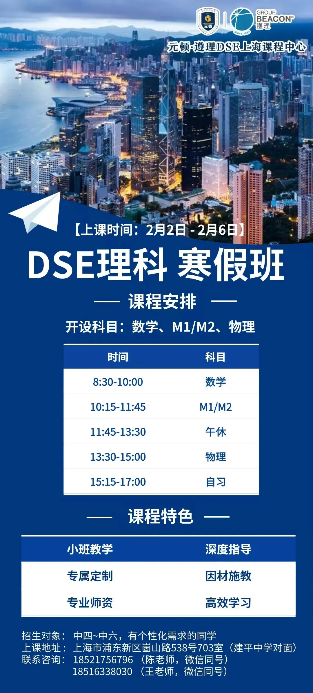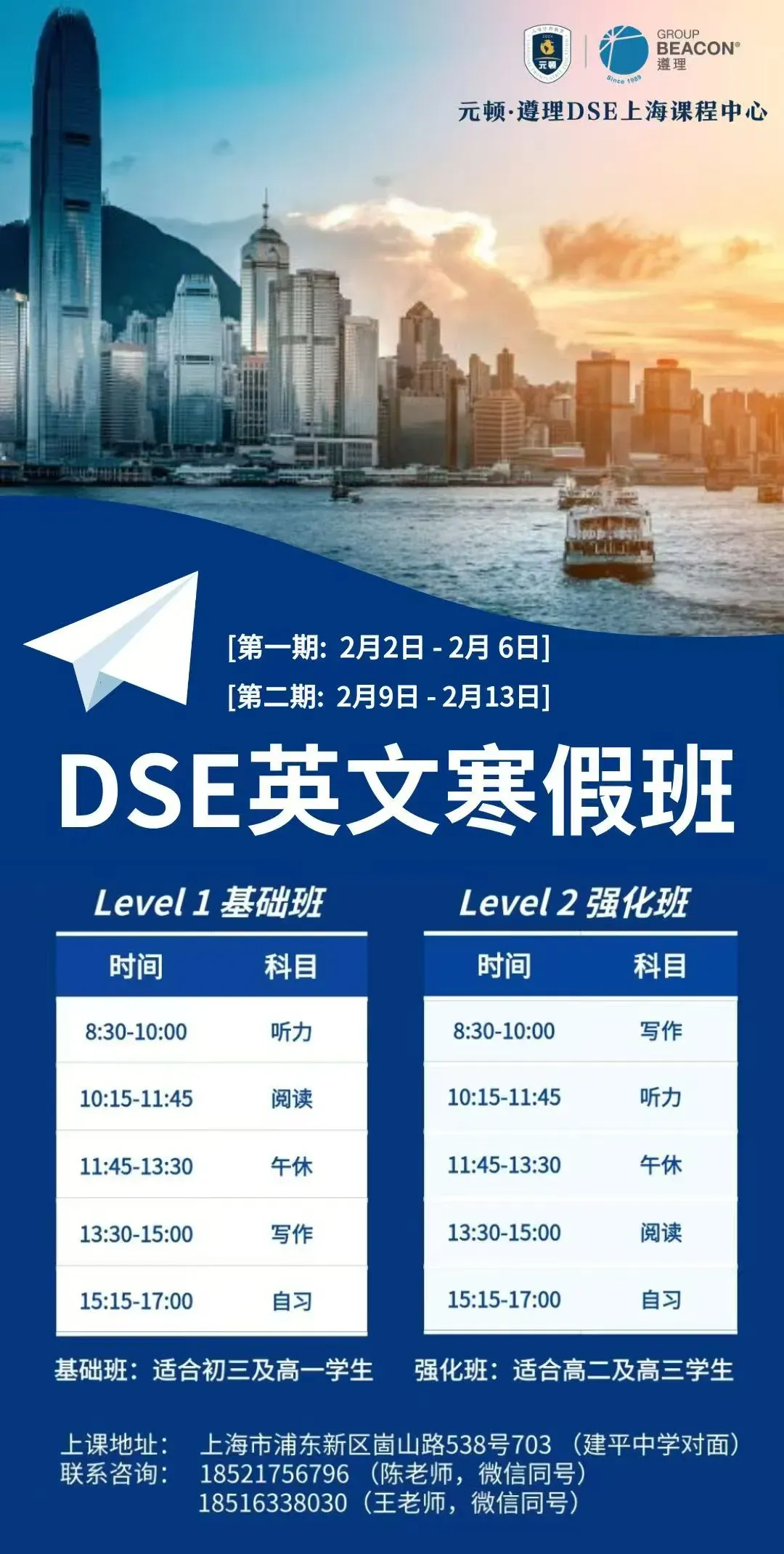 结合不同需求,元顿·遵理DSE上海课程中心开设DSE全年班的同时,并结合不同家庭的需求,于假期开设DSE衔接课程,内容涉及英语、数学、经济、物理等,如对课程感兴趣的学生或家长,也可以通过海报中的联系方式或扫描海报中的二维码,联系我们。