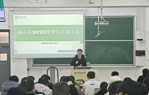 近日,强化培养学院2023 级升学及考研主题年级大会在学海楼412教室顺利举行。辅导员袁佳斌老师主持会议并与同学们深入交流,新航道南京学校参与活动并做专题辅导。