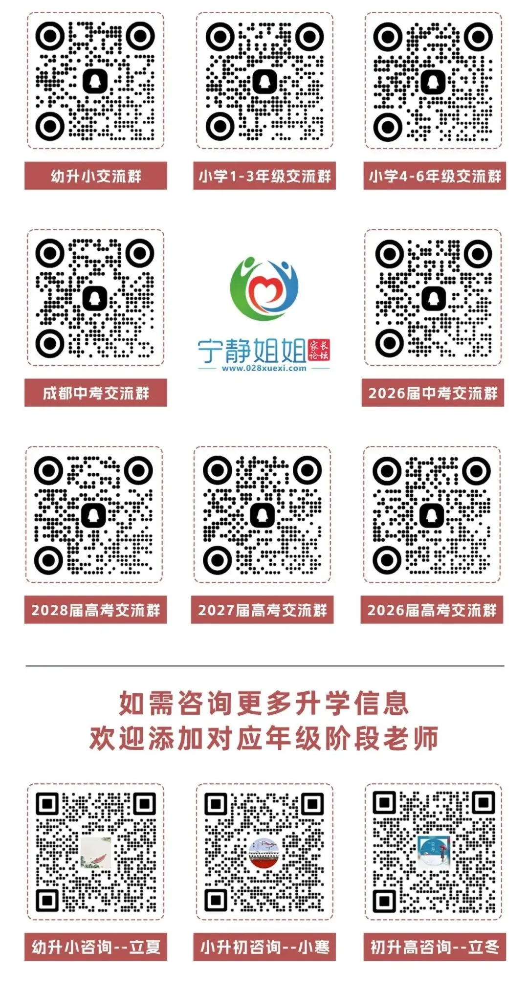 宁静姐姐家长论坛Q群和微信群汇总,大家可以选择自家孩子相应的年级群加入哦!群内均是成都各年级学生家长,有升学问题都可以群内咨询。打破升学信息差:最新资讯,直播讲座,重要时间节点提醒,共享学习资源....进群后即可在【群公告】免费领取对应年级最新期末真题~所有群都会随着孩子的年级而升级,一直到孩子大学,大家不用每年换群!希望和家长们一起共同交流,提升学习,期待您的加入~1、宁静姐姐家长论坛Q群每个家长只能加入1个孩子对应的年级群,多加无效!