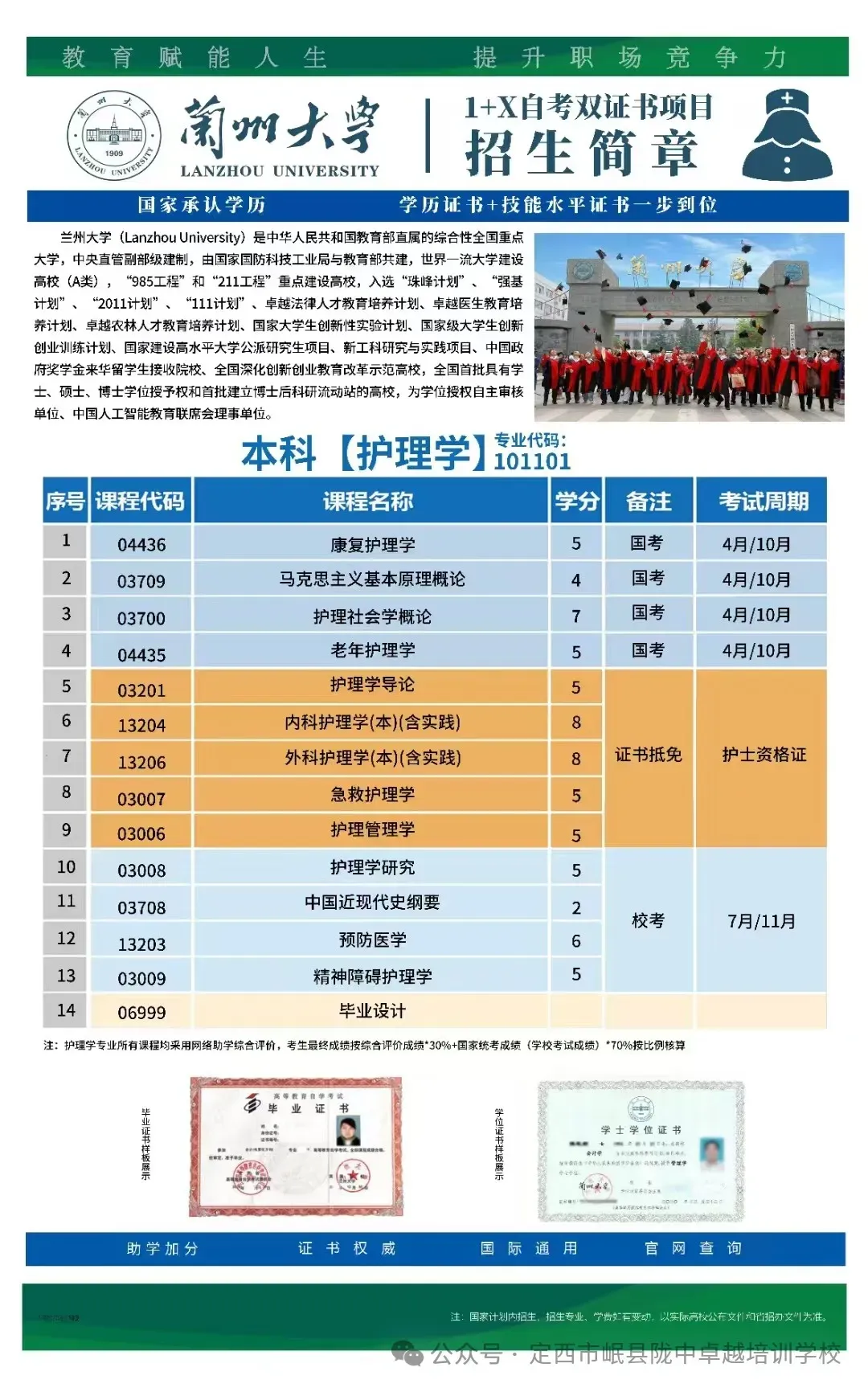 >兰州大学高等教育自学考试“1+X”自考双证书项目招生简章——护理学
