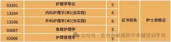 经甘肃省高等教育自学考试委员会印发《关于开展高等教育自学考试“学历证书+若干职业技能等级证书"试点工作的通知》甘考委发(2023]3号),畅通学历证书和职业技能等级证书之间学习成果得到认定和转换,即兰州大学应用型(1+X项目)护理学专业取得护士资格证书者,可申请免考指定课程,免考课程如下: