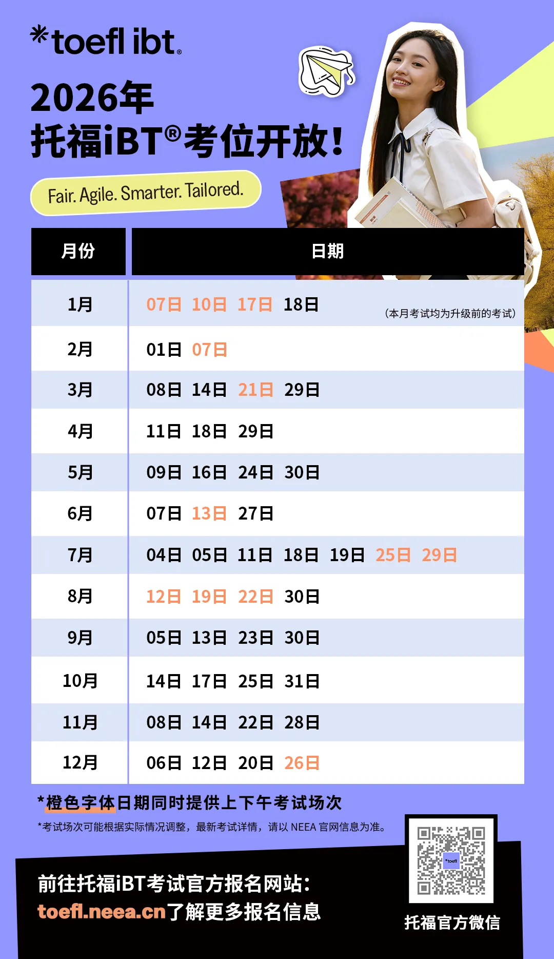 2月1日起,新托福考试正式开启,考试题型同步调整。2026年托福考试全年计划开放47个考试日期,共59场考试,较2025年减少10场。