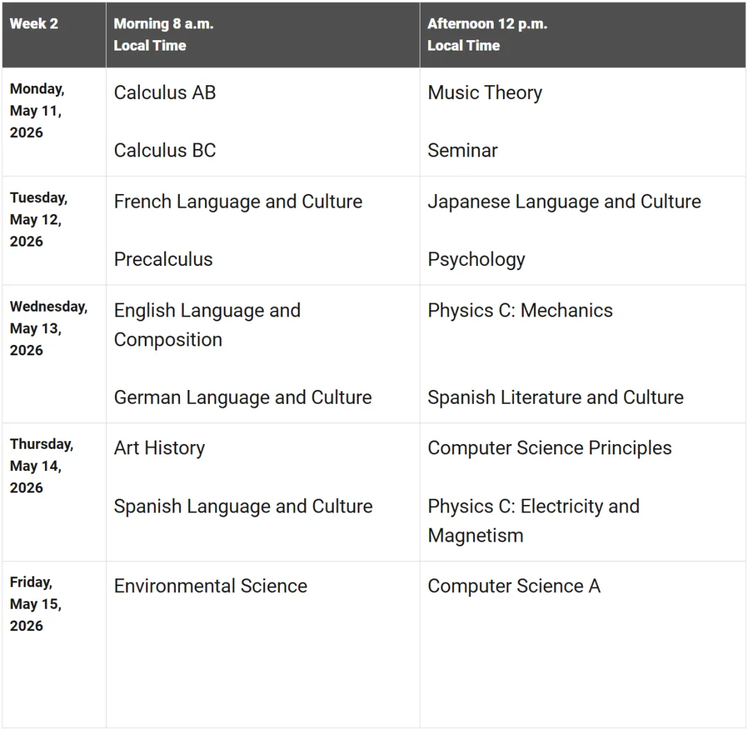 2026年AP常规考试时间为2026年5月4日 - 5月15日,分为两周进行。