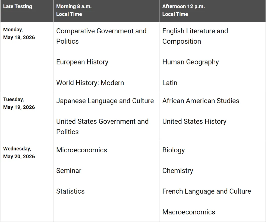 2026年AP延迟考试时间为2026年5月18日 - 5月22日。