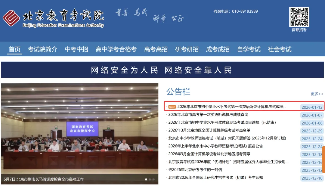 今天,2026年初中学考第一次英语听说机考成绩发布。1月12日起,考生可登录北京教育考试院网站进行查询。