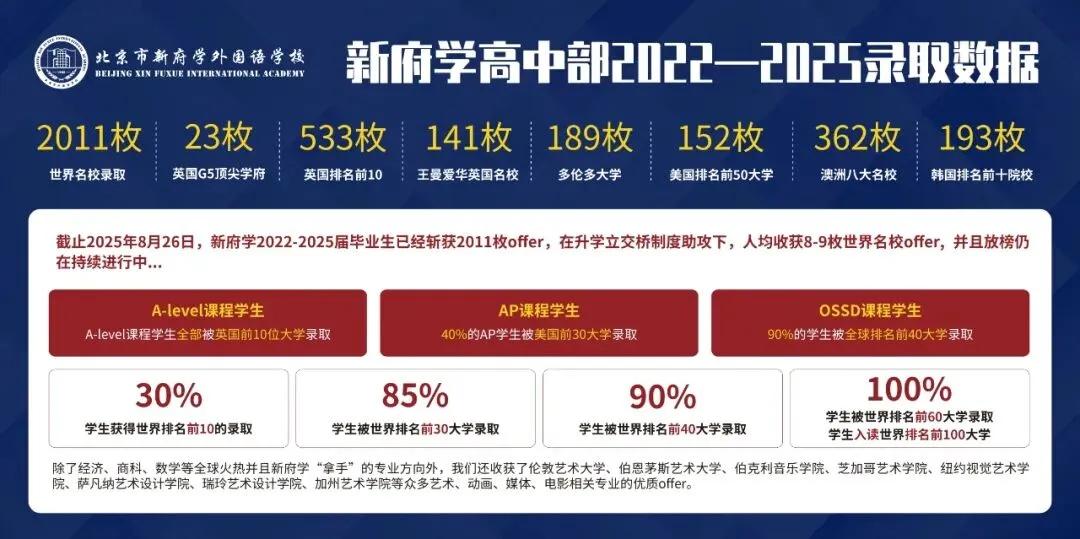 成果是这一体系最好的注脚:2022-2025届毕业生累计获得全球2011份offer,85%的学生进入世界TOP30名校。学校系统性地铺设了七大升学方向:中国大陆名校、美术高考、英语母语国家留学、日韩留学、新马留学、艺术留学、中国香港升学,并支持多国混合申请,真正实现“一人一策”。