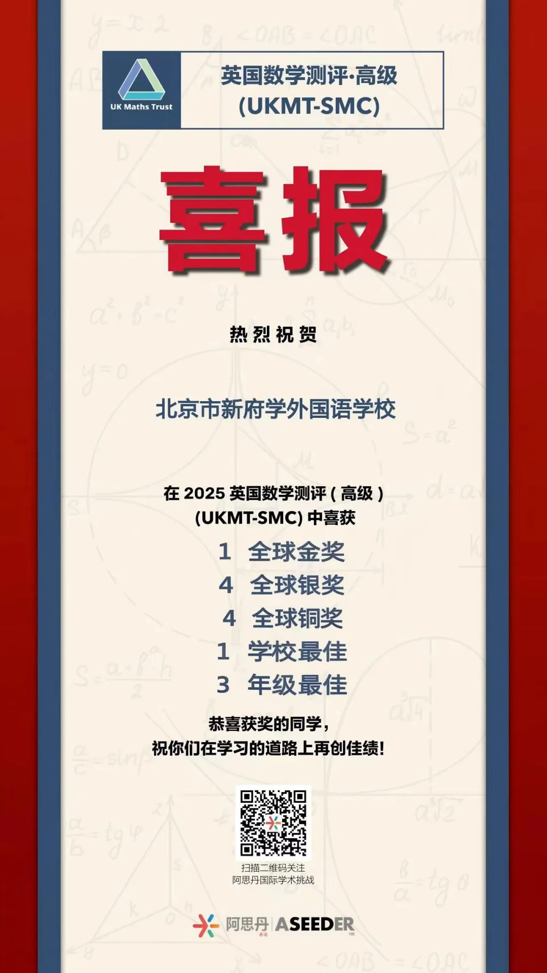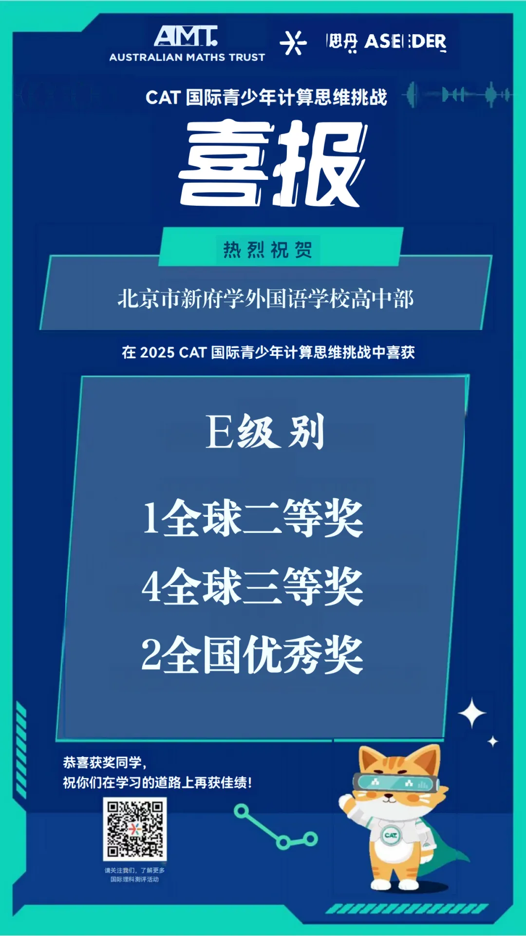 仅2025年,新府学高中部学生就在UKMT-SMC英国数学评测-高级、阿思丹模拟商业挑战、CAT国际青少年计算思维挑战、袋鼠数学等众多赛事中斩获金奖、银奖、铜奖。美术高考班联考本科过线率达95%。这些看得见的成果,让全面发展从一个理念,变成了可触摸的现实。