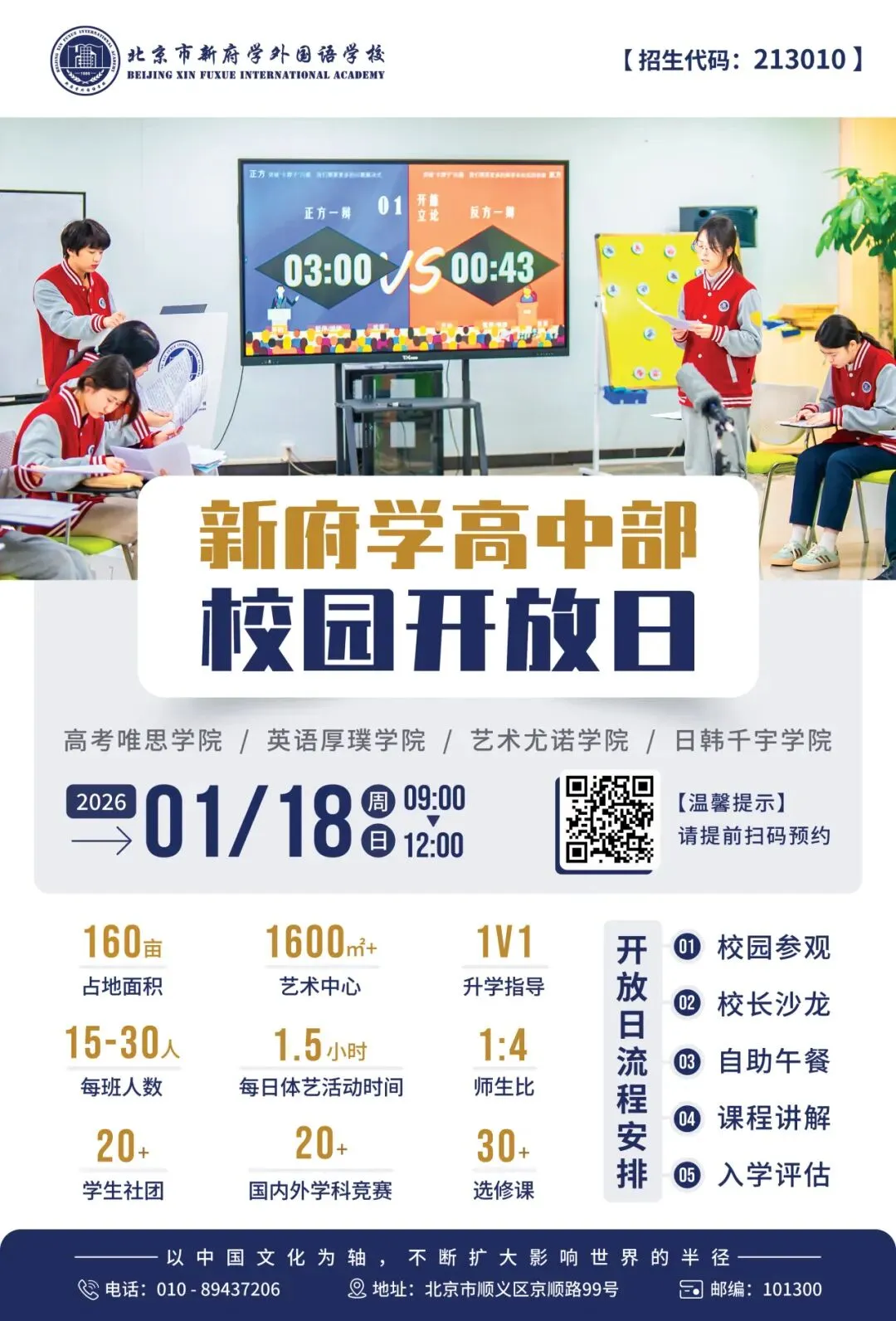 这里是北京市新府学外国语学校高中部,现招收春季插班生、初中应届毕业生,我们将在1月18日(本周日)开展大型综合开放活动,包含参观校园、课程咨询、校长面对面、入学评估、升学规划指导、自助午餐等,扫描开放日海报二维码或点击文末“阅读原文”即刻预约开放活动!