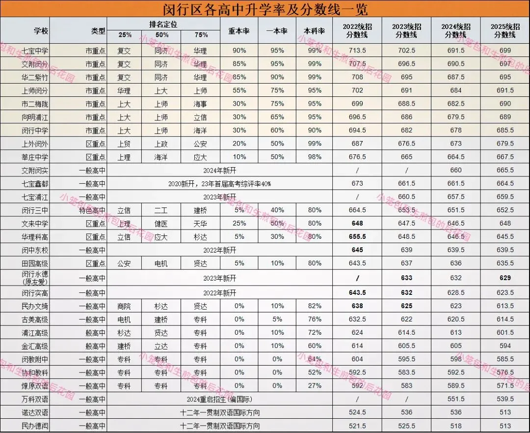 1.各高中按照2025年统招平行志愿录取分数线排序;4.闵三强的前25%定位交复,前50%都能定位到同济及以上;以上是2025届闵三强的清北交复升学率。交复统计的只是综评率,还有统招批次没有计算。5.有三所普通高中的录取分数线高于区重点和特色高中:交附闵实、七宝鑫都和七宝浦江;都是分校,只是因为新学校,所以还是普高,但大家的期望比较高。6.除了闵三强后面的市重点,前25%的定位就是上大。7.从区重点开始前25%就是定位上贸,上理,能考上上大就是非常前面的;8.其实,我个人认为上闵外虽然只是区重点,但是未来出口不比其他区的一些市重点差,所以所谓的685以下就断档不存在。9.倒是660-680的分数段需要选择,到底是老区重莘庄中学,还是七宝鑫都、七宝浦江和交附闵实中挑选?我个人会比较看好交附闵实。而且这个分数段可以跳出闵行看看。我们后面会在全市层面看看这个区段有哪些高中出口还可以。10.从闵行三中以下,基本上前25%的定位就开始进入民办大学了(除了文来高中-这点后续我们要验证下是否数据有误)11.大家可以看到,闵三强的重本率和一本率和下面的学校有一个断崖式的下降。但本科率其实变化不大,也验证了我们的一句话:读个本科已经不是一件难事,而读个好本科才是难事。头部越来越卷,卷不动的话,何不赶紧另辟蹊径。