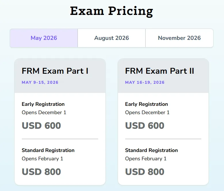 2026年FRM考试安排已确定,分别是5月、8月、11月考期。各个考期安排如下:- 早鸟报名时间:2025年12月1日-2026年1月31日