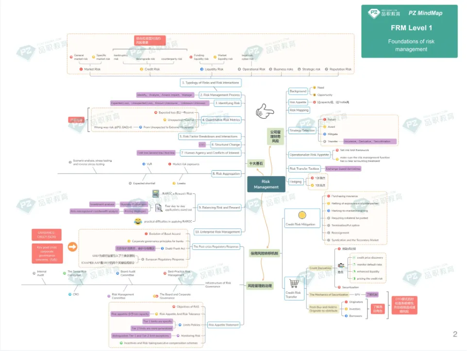 F君建议:大家可以参照品职【FRM思维导图】,将知识点内部联系梳理出来 。把一个学科等同于一棵树,尝试层层发散,开枝散叶,做到既见主干,又见枝叶。