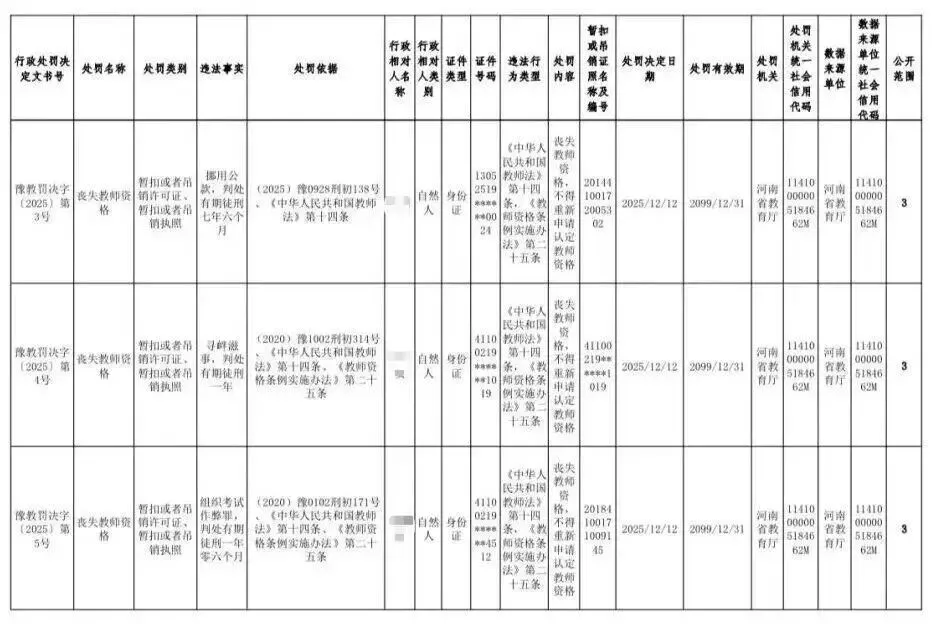 河南省教育厅于2025年12月31日发布《2025年撤销高校教师资格行政处罚》通告,依法对省内5名高校教师作出丧失或撤销教师资格的处理。