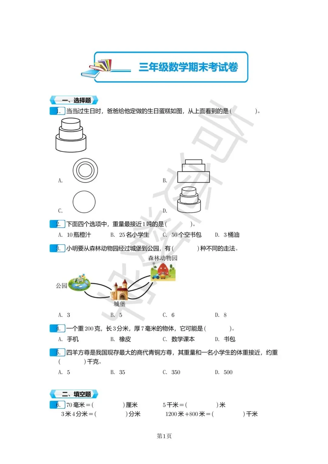 三年级上数学期末考试卷及参考答案
