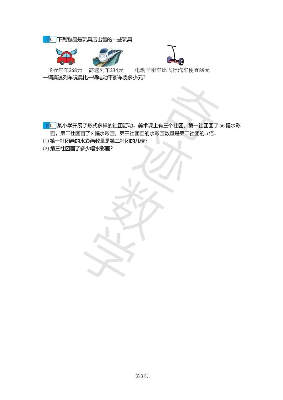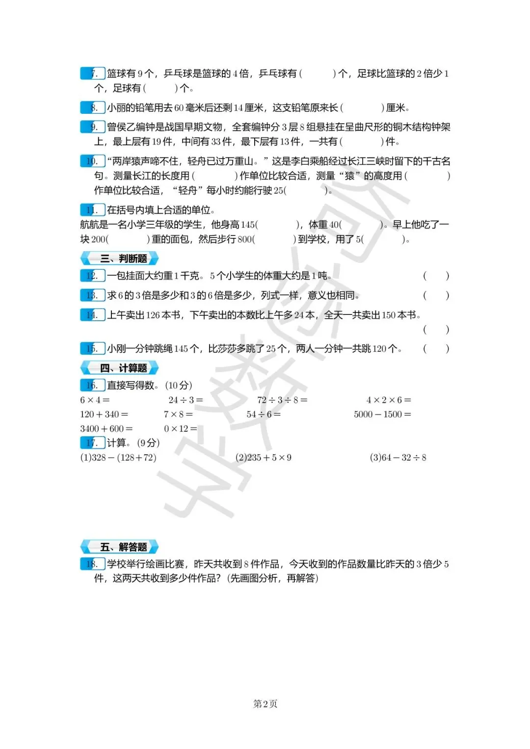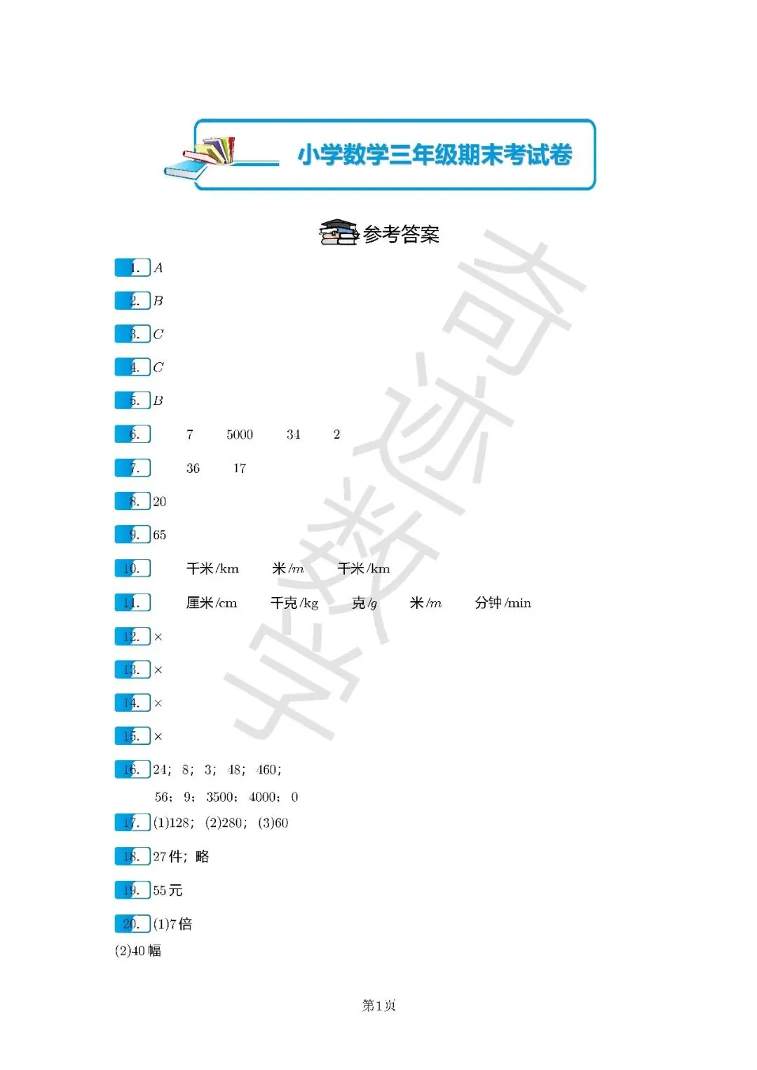>三年级上数学期末考试卷及参考答案