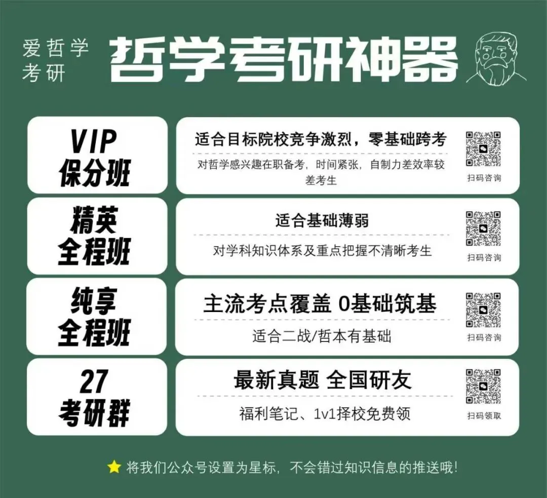 如果你说你虽然是哲学系的学生,但感觉自己就是理解和掌握不了,或者说是跨专业的考生,对哲学的体系很陌生没有概念,那可能就需要一些专业负责的人,来对这些参考书目,考试科目进行一些讲解,对你进行一些有针对性的辅导(比如,关注我们的公众号:爱哲学考研Phil,再次插一个硬广)但总得来说,正如我前文所言,这个门槛并不是特别高的。