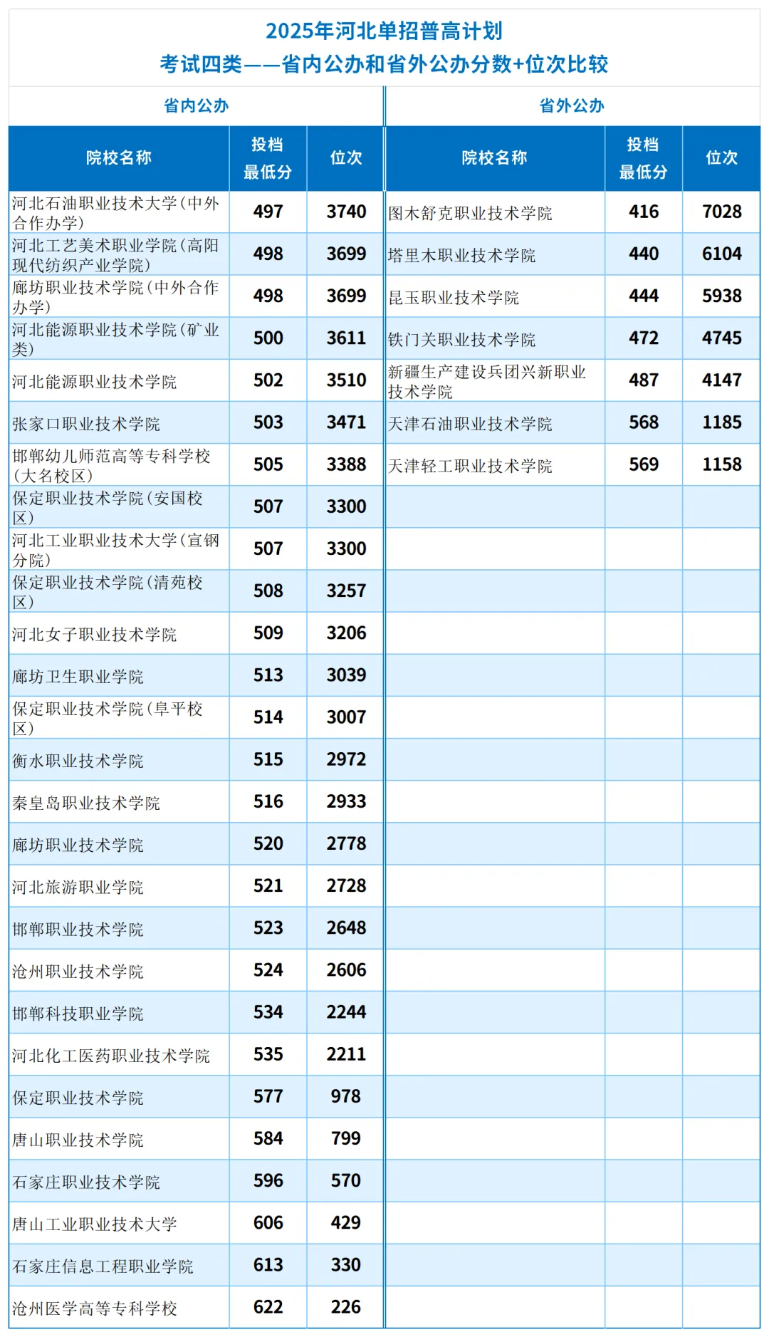 中高分段(550+):保定职业技术学院(577)、唐山职业技术学院(584)等,位次前1000;