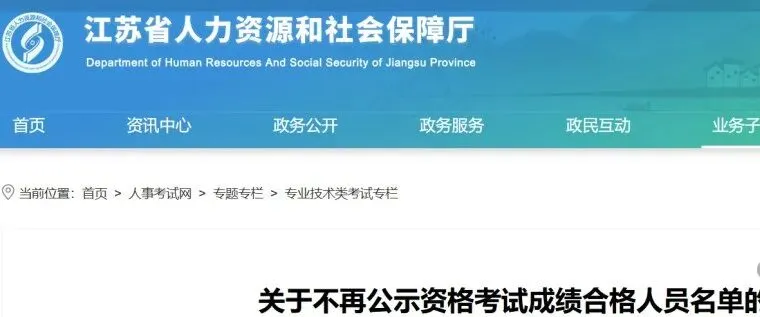 根据人社部人事考试中心有关工作要求,自2025年6月起,我省不再对全国专业技术人员资格考试合格人员名单进行公示。考生可登录中国人事考试网查询成绩和合格线,登录江苏省人力资源和社会保障厅网上办事大厅“个人办事-人才人事-江苏省人事考试报名-专技类资格考试审查结果查询”查看本人资格审查结果。