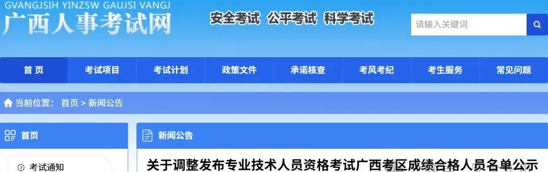 关于调整发布专业技术人员资格考试广西考区成绩合格人员名单公示的通告