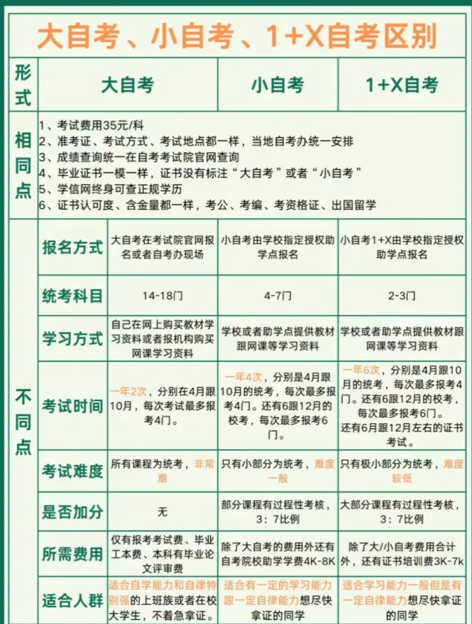 4.大小自考和1+X:大自考所有科目全是统考,一年两次考试,小自考和1+X自考分统考和校考,一年四次考试