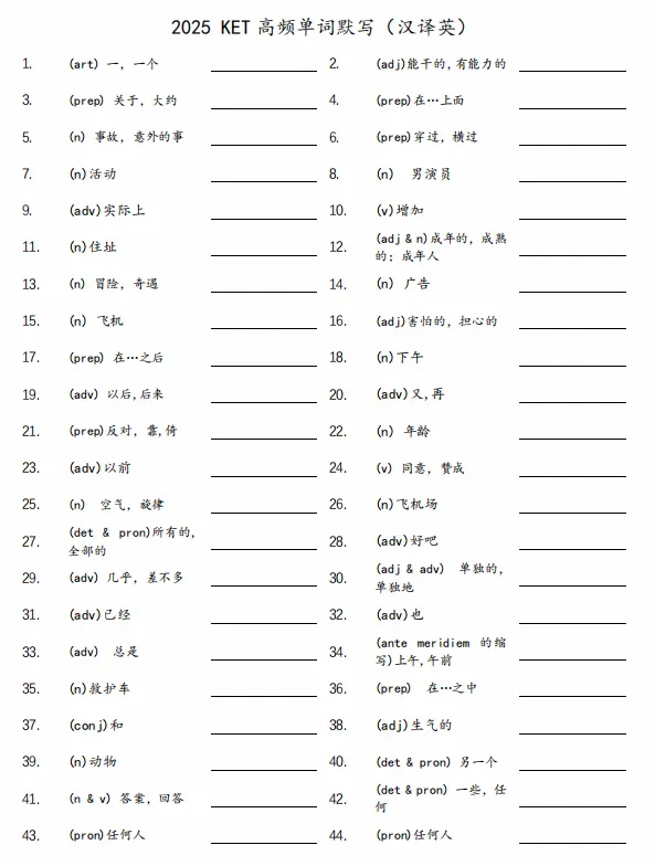 这份KET考试高频词汇资料专为考生高效备考设计,可直接打印使用,搭配音频能同步跟读纠音,自带默写栏可即时检测记忆效果~