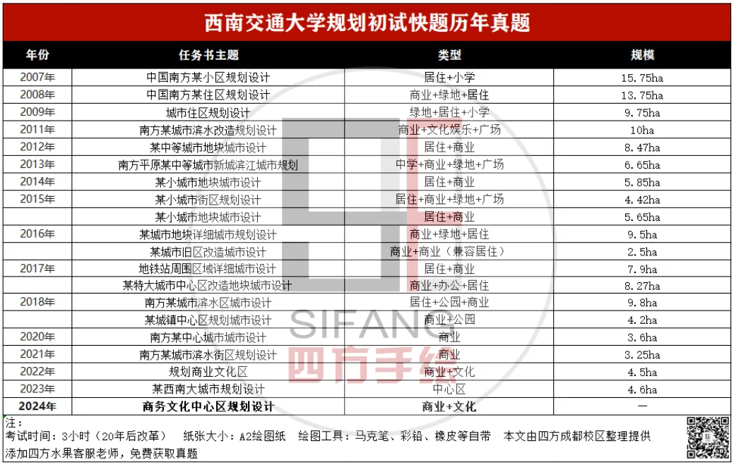 西南交大的快题考试喜欢考:居住、商业 附加学校、公园、绿地等进行综合的考察。混合地块,多临江。